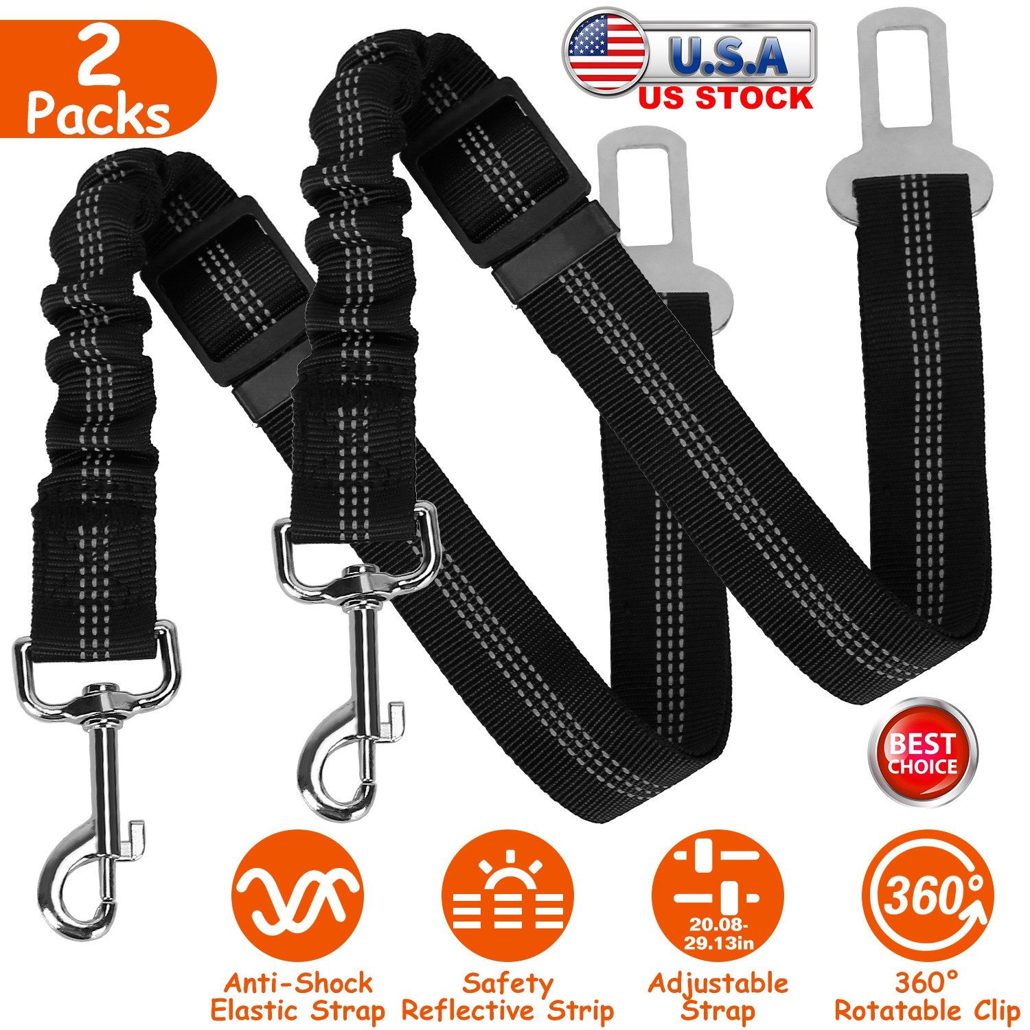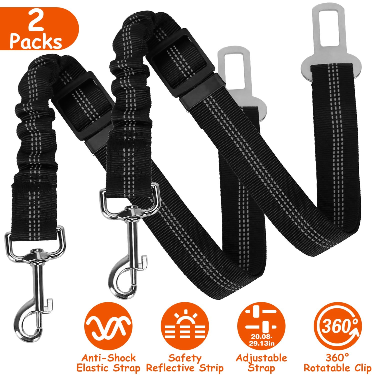 Featured with adjustable and elastic design, our dog safety seat belt can be adjusted from 20.08in to 29.13in, suitable for small, medium pets and providing a great buffer under suddenly braking or turning to protect your dogs from hurting. The 360° swivel clip allows your pet to move around without tangling the strap. The tab on the seatbelt clip with size of 2.35x0.83in is compatible with most vehicles.