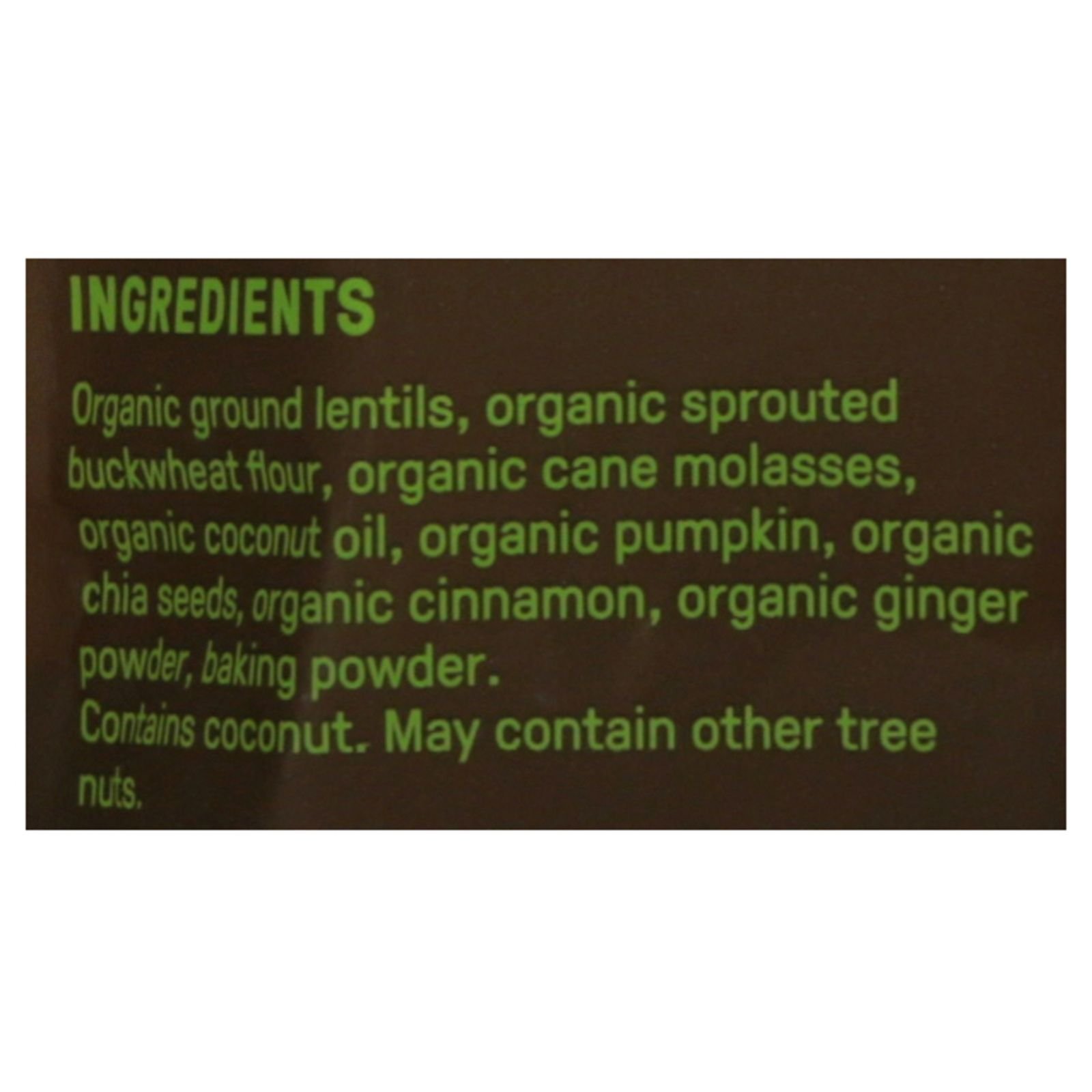 ingredients : organic ground lentils;organic sprouted buckwheat flour;organic cane molasses;organic coconut oil;organic pumpkin;organic chia seeds;organic cinnamon;organic ginger powder;baking powder
