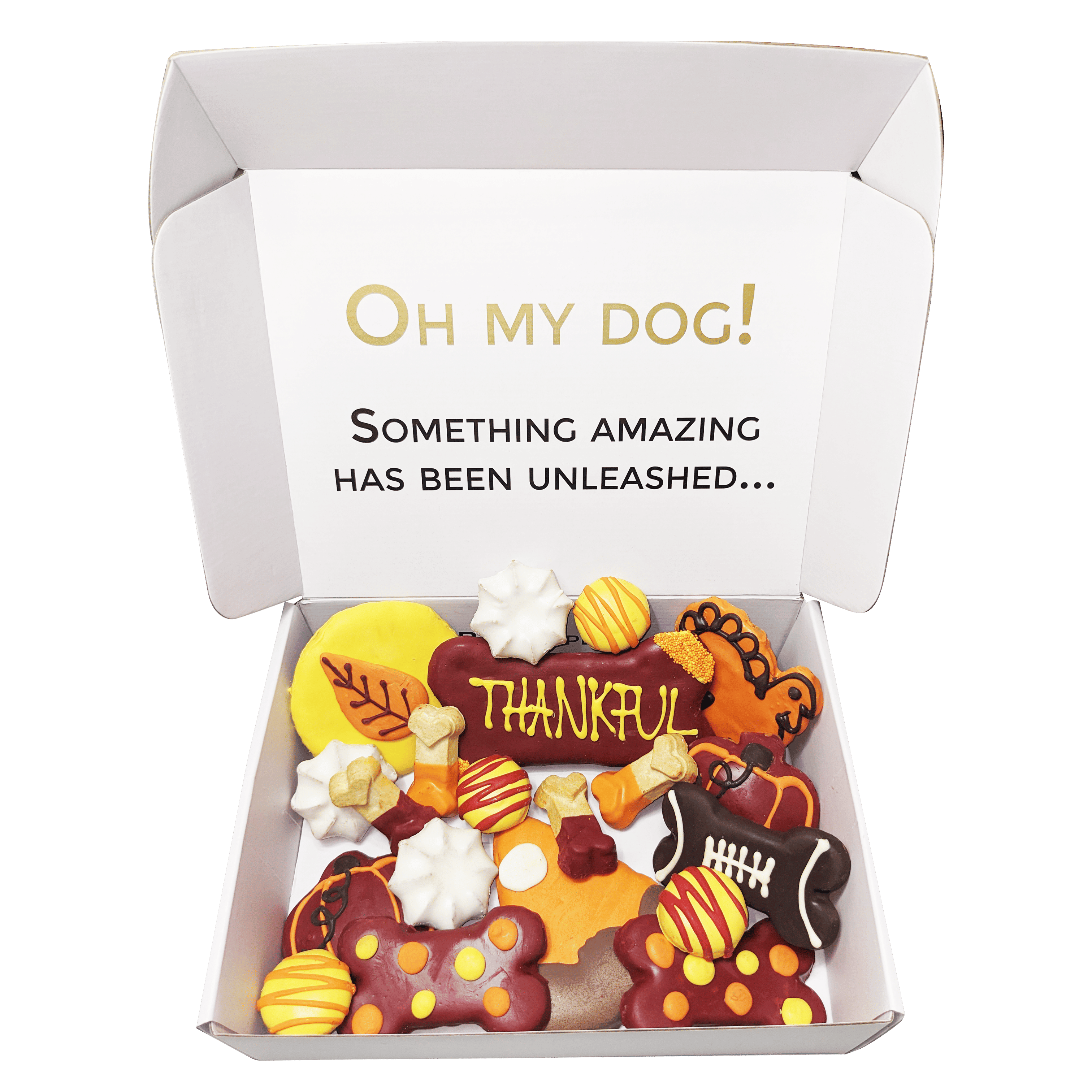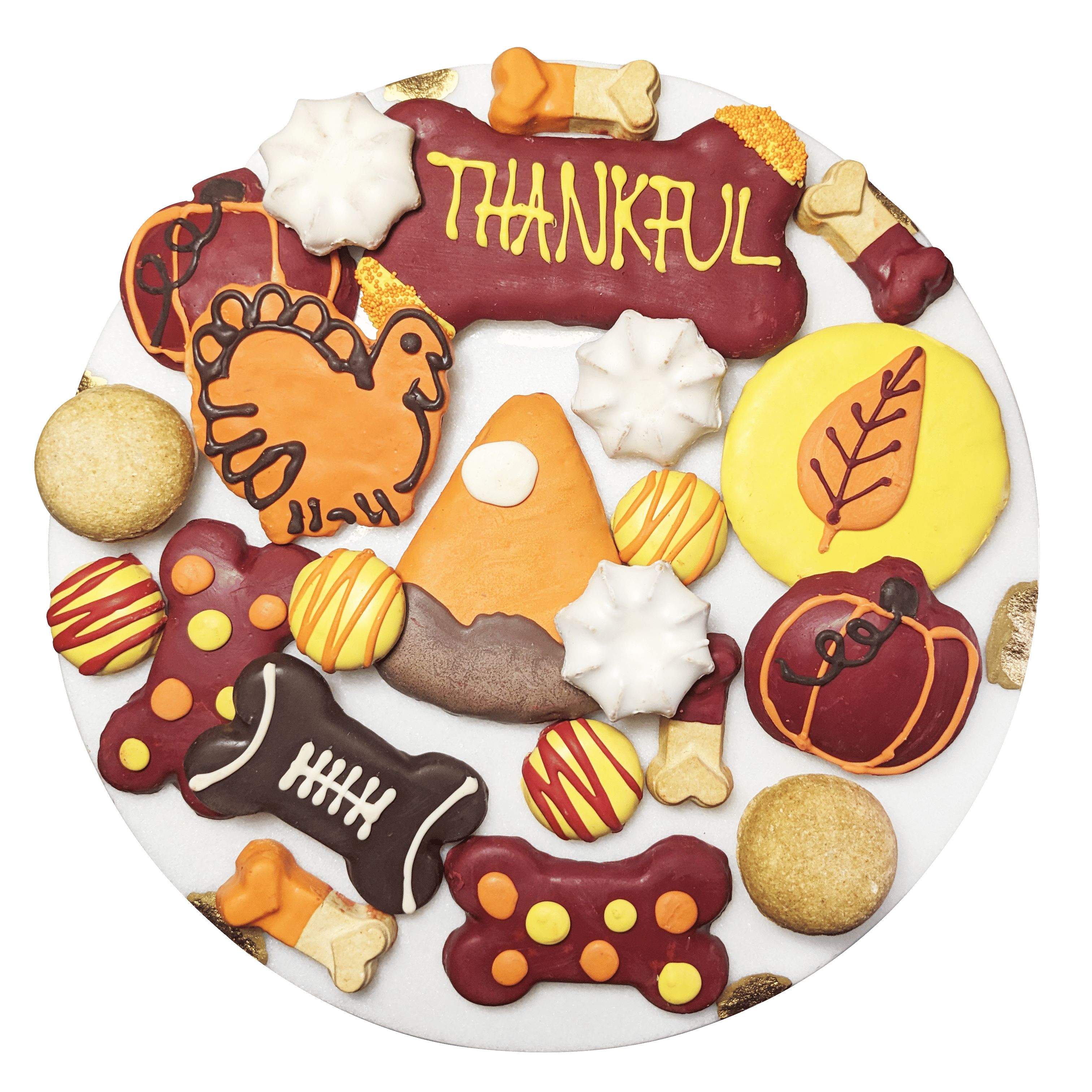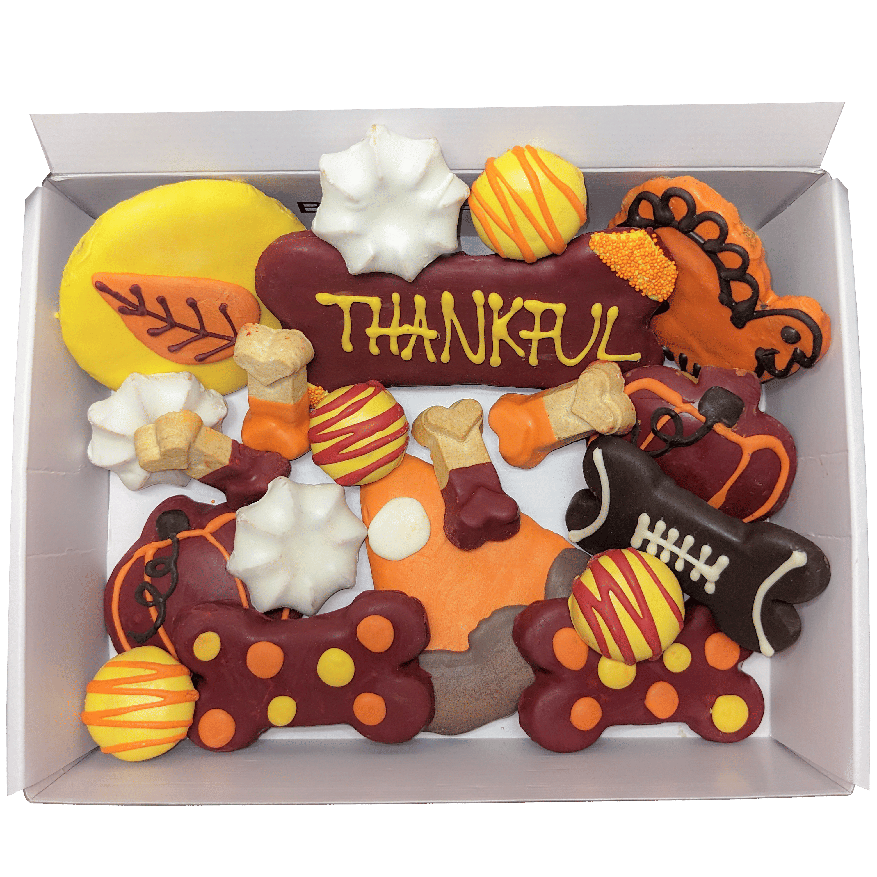 Includes 22 themed treats including autumn leaf, pumpkin pie, and turkey shaped biscuits accompanied by dog macarons, dog bones etc.