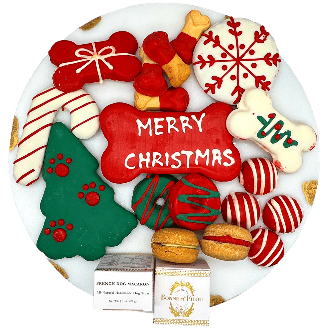 Santa Paws is comin’ to town with a special delivery - our exclusive Christmas Box brimming with 18 decadent handmade holiday themed treats (macarons, bones, snowflakes, truffles, and trees) to absolutely spoil your pup!