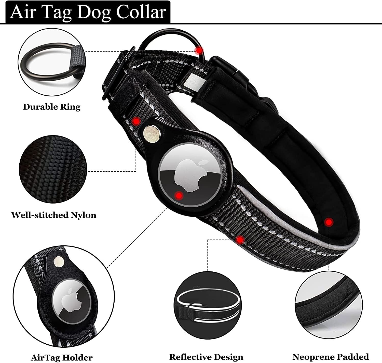 INTEGRATED DESIGN FOR AIRTAG: Are you always wondering where is your dogs or cats? Or are you always trying to find him/her? We're proud to announce our latest AirTag Dog Collar; integrated the AirTag Holder with premium basic Dog Collar. With our AirTag Dog Collar; allows you to keep tracking your beloved ones! (Note: The AirTag is not included) FIRM & COST EFFECTIVE: Bolting with the screw; the built-in leather pocket as Dog AirTag Holder is a perfectly fit and prevents your AirTag to lose or drop from it. 100% firmly combined with the Dog Collar; ensures your Apple AirTag stay connected with your dogs/cats. Plus; you won't need to purchase other detached; easily lost AirTag products. PREMIUM MATERIAL: Designed with premium material; reflective stripe; waterproof webbing and strict stitching ; our Air Tag Dog Collar is also featured with soft neoprene padding; prevent your dog's from any irritation or discomfort. No sharp edges or unfold sewing join; and sturdy premium plastic buckle and alloy D-ring ensures your dog's safety. PRODUCT FUNTIONS ENGINNERING: Our Air Tag Dog Collar is more convenient to release with the one-hand quick release buckle; and the D-ring provides a secure attachment for your dog leash and hanging accessories. The strong reflective stitching and edges make your dog's easier to be seen in darkness; safer for walking; running or jogging in the wild. MULTIPLE SIZE OPTIONS: The whole package includes: Airtag Dog Collar x1; Screwdriver x1. Our heavy duty Dog Collar comes with 4 colors and 4 sizes; perfect for small; medium and large dogs. Please measure your dog's neck before your purchase. S: 12"-14"; M: 15"-18"; L: 17"-20"; XL: 19"-22". (Neck Circumference in INCHES)