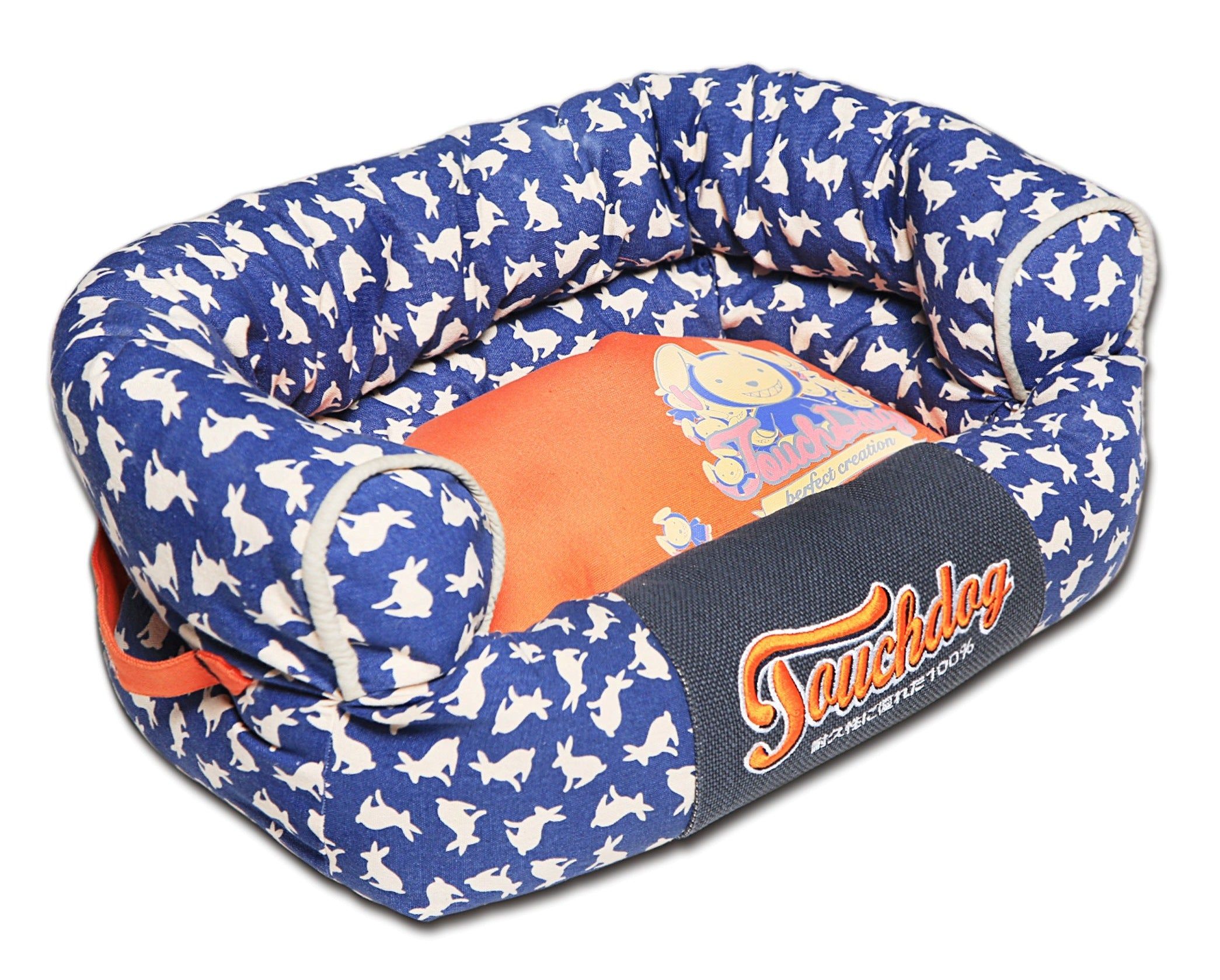 The Touchdog Lazy-Bones Rabbit-Spotted Premium Easy Wash Couch Dog Bed is composed of a Cotton-Polyester Outer shell and Inner-Lined with Plush Polyester. Additionally this Pet Bed features a Reversible and Removable cushion. The cushion has the ability to zip open for machine wash placement of the inner polyfill contents. Has a Couch-like appearance and features accented thick stitching along the couch borders. Complimented with the Touchdog Embroidered stamp of perfection along the front with a designer print on the accented Removable and Reversible Polyester-Cotton plush cushion. Every intrical trim is designer coordinated to compliment. Completed with a built-in side carrying handlebar. Touchdog, the leading Premium Pet Brand of Tomorrow. Available in Multiple Sizes Colors